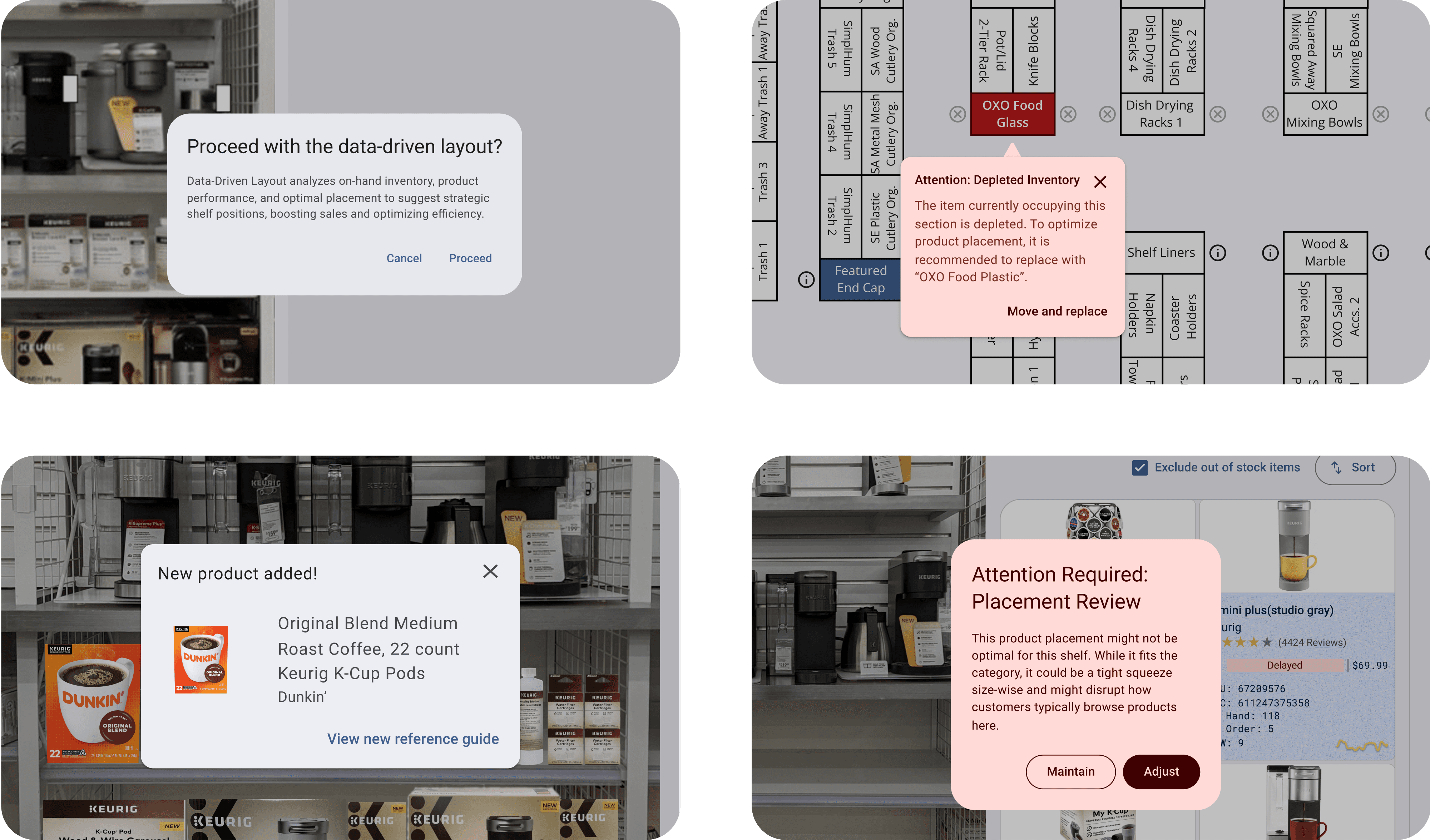 To address user confusion regarding hidden related products and a cumbersome click-and-drop feature, the design was iterated to integrate product cards directly onto the virtual shelf. A clarifying dialog box was added, and a hover-and-tap mechanism streamlined the product placement process, improving overall usability.