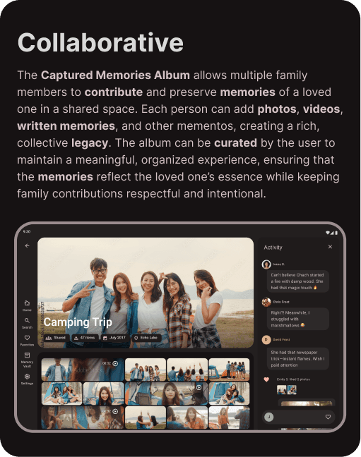 I interviewed individuals who have experienced the loss of a loved one to gain a deeper understanding of how they navigate grief and preserve memories. These conversations shed light on the emotional significance of digital remembrance and the ways people want to stay connected to those they’ve lost. This insight led to a key realization about the importance of collaborative memory-sharing, prompting additional exploration into how families and friends can contribute to a shared remembrance space.