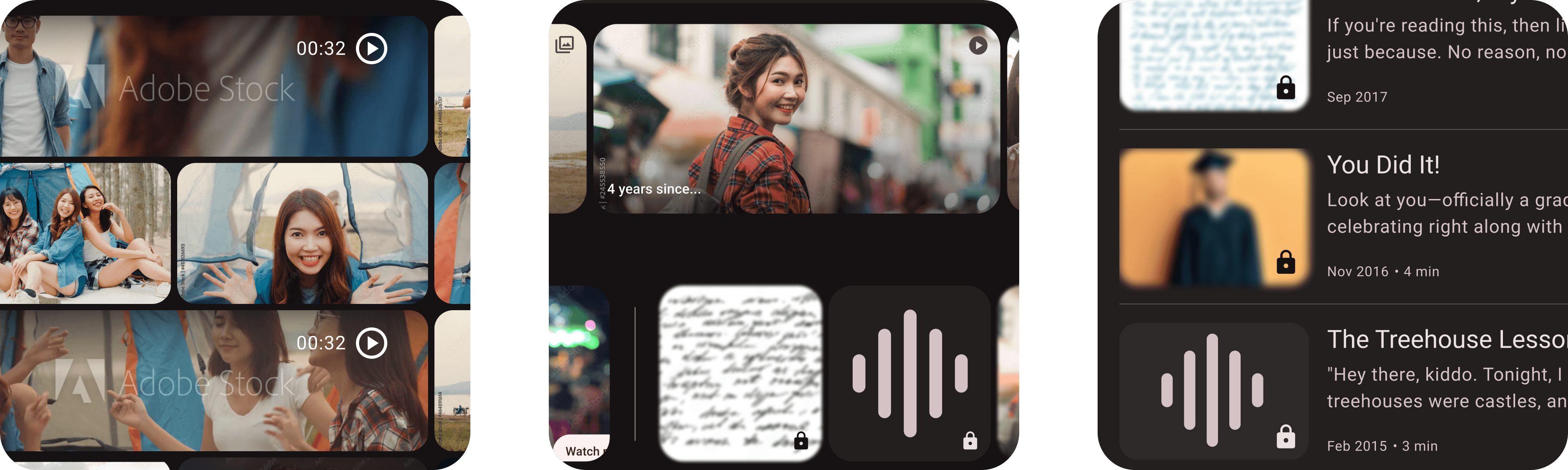 Identifiers: To ensure all users could easily identify media types and their accessibility status, we incorporated distinct icons for videos, audio files, and documents. These icons also visually indicate whether the media is locked behind the memory vault. This approach improved accessibility for individuals with visual or cognitive differences, reduced cognitive load for all users, and provided clear and predictable media identification, contributing to a more inclusive and user-friendly experience.