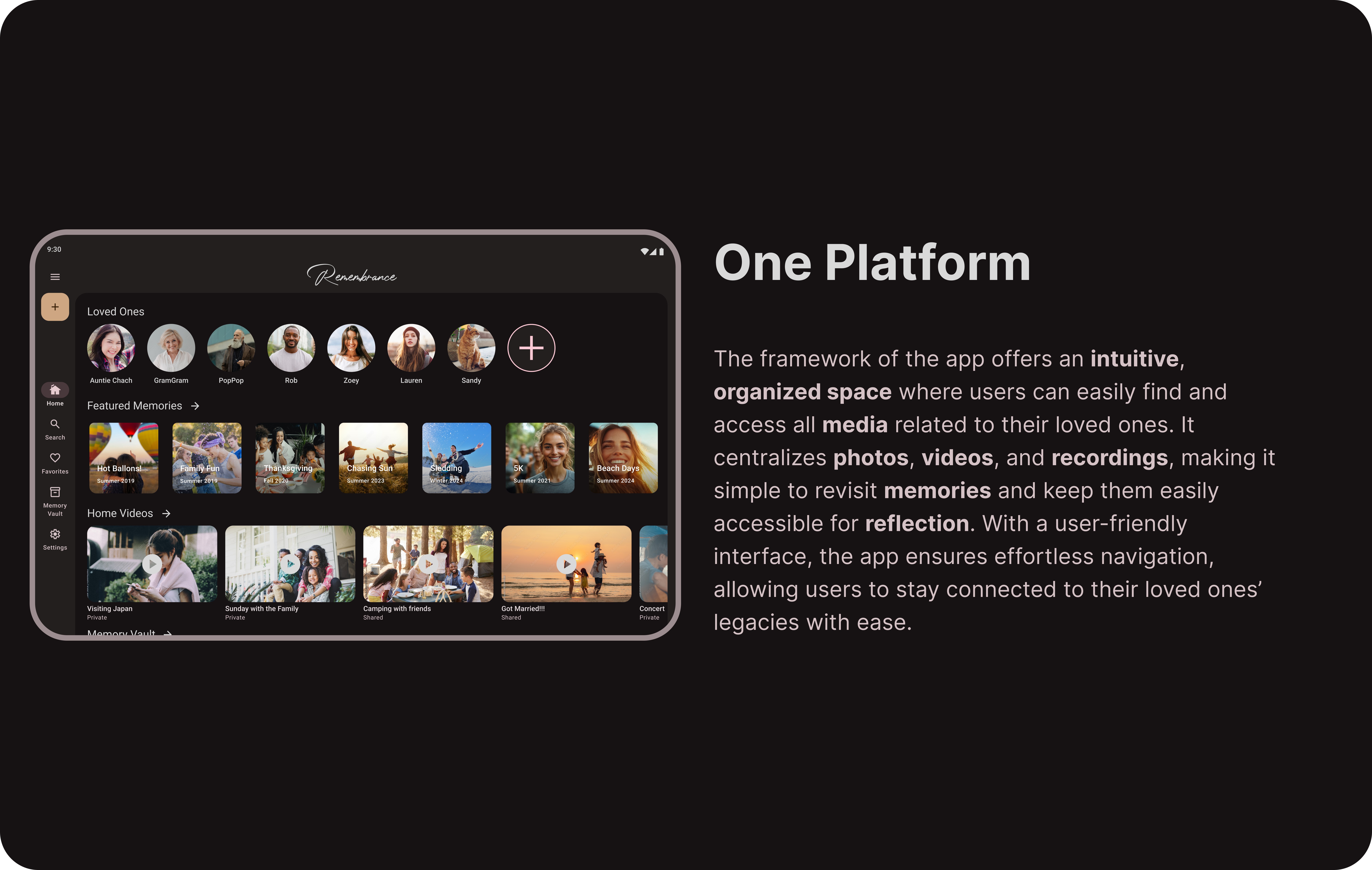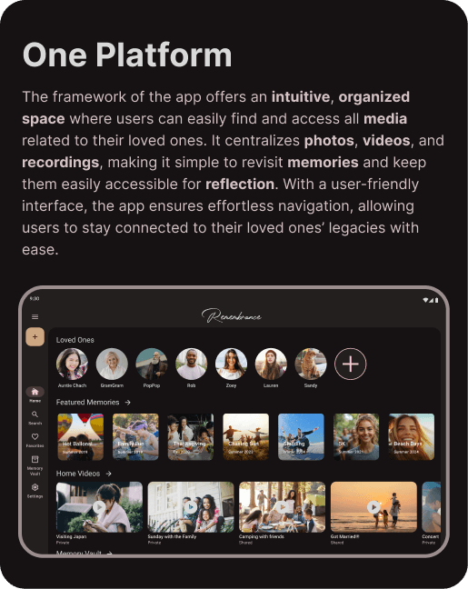 As technology evolves, traditional ways of preserving memories are fading, with aging home videos and photos becoming harder to revisit and handwriting becoming less common. Without a dedicated space to reconnect, memories of loved ones remain scattered across different platforms and formats. There is a need for a solution that thoughtfully preserves and presents their stories, voices, and presence in a meaningful way.