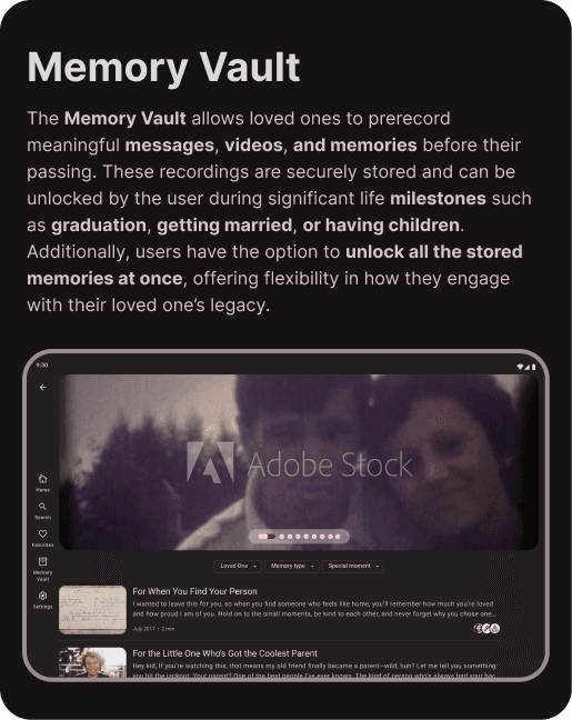 The remembrance app helps users stay connected to past loved ones through meaningful digital keepsakes. It offers a space to store and revisit home videos, audio recordings, and milestone-locked messages recorded before their passing. Inspired by the power of memories, the app creates an interactive way to preserve voices, stories, and personal moments.